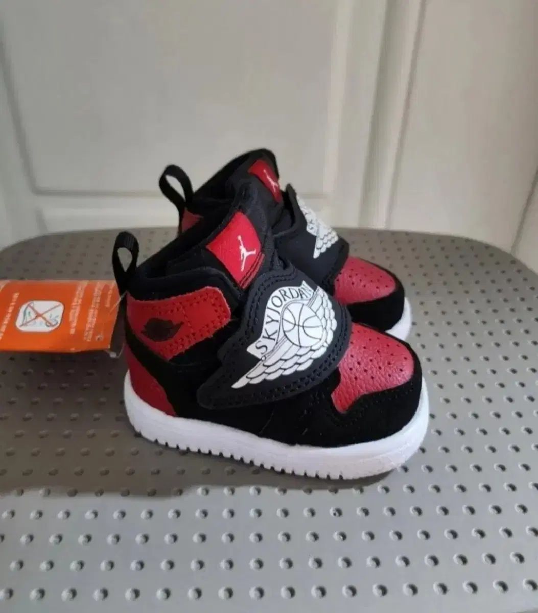 このDahlinブランドの新しいナイキスカイジョーダンの幼児用靴はタグ付きです。赤と黒の色の組み合わせがとても美しいです。サイズは80ですのでご注意ください。