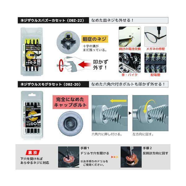【特長】●組み合わせによって様々なシーンのネジトラブルに対応する合体工具セット。●DZ-70/強力なトルクを生む、人間工学(エルゴノミクス)デザインのドライバー。●DBZ-20、DBZ-21/独自の先端形状により、潰れたプラスネジ、六角穴付きボルトを叩かず外せます。●DR-19/強力マグネットでネジを落とさず確実に保持できます。●DR-23/叩いて使える、タフネス構造のエクステンションバー。●DR-25/壁際のネジもはずせるジョイント付きエクステンション。●PZ-67/サイズを気にせず一発ロック、ネジザウルス機能