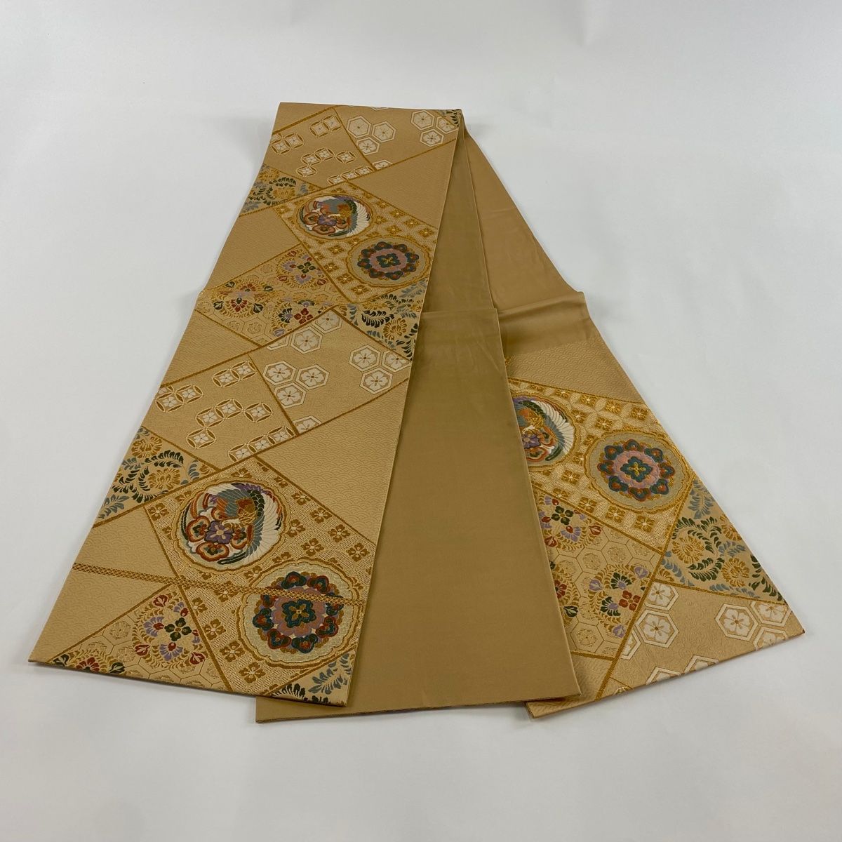 袋帯 秀品 華文 鳥 箔 金糸 薄茶色 六通 正絹