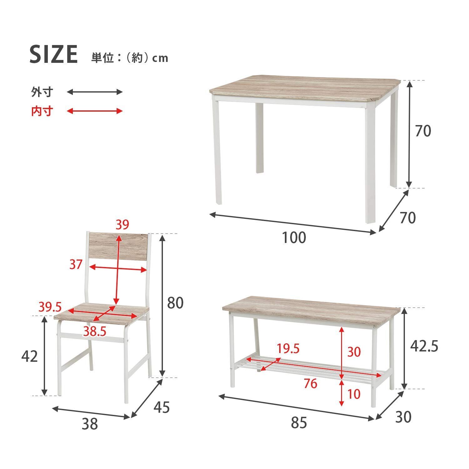 【テーブル】:(約)幅100×奥行70×高さ70cm 【チェア】:(約)幅40×奥行47高さ80cm 【ベンチ】:(約)幅85cm×奥行30×高さ42cm